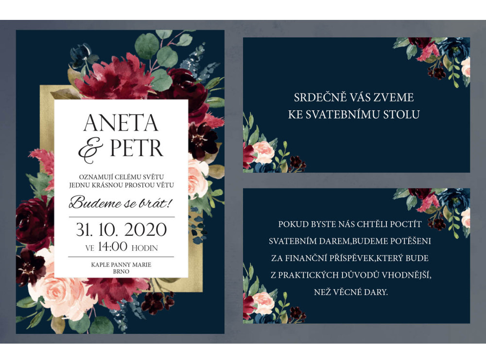 Tmavě modré svatební oznámení pro odvážnější a výraznější svatby.