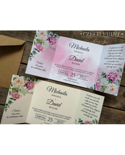 Spojuje klasické svatební oznámení a i pozvání ke stolu a dary & přání. Napsat do něj můžete cokoli si budete přát!