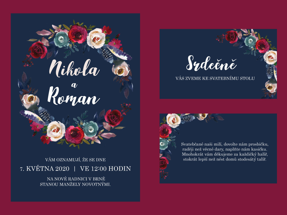 Ve stejném stylu zhotovíme kartičky pro zasedací pořádek, pozvání ke stolu, fotokoutek a další.